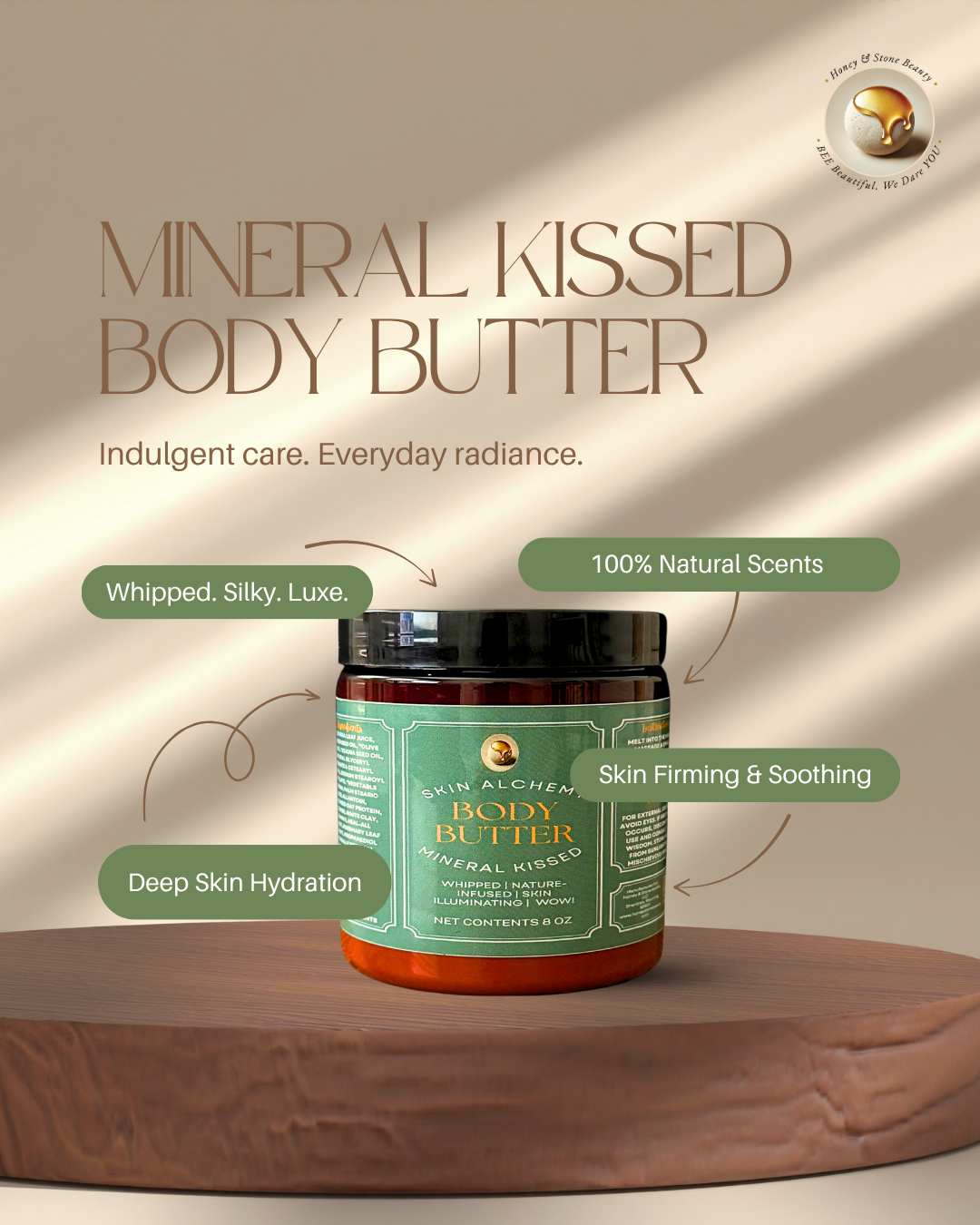 At Honey & Stone Beauty, we believe in honest skincare that honors both you and the planet. That means no parabens, no phthalates, no silicones—just earth-aligned, cruelty-free ingredients that work. Each jar of Mineral Kissed Body Butter is thoughtfully made to be gentle enough for sensitive skin, effective enough for visible results, and indulgent enough to feel like a treat. Because you deserve skincare that’s as real and radiant as you are.